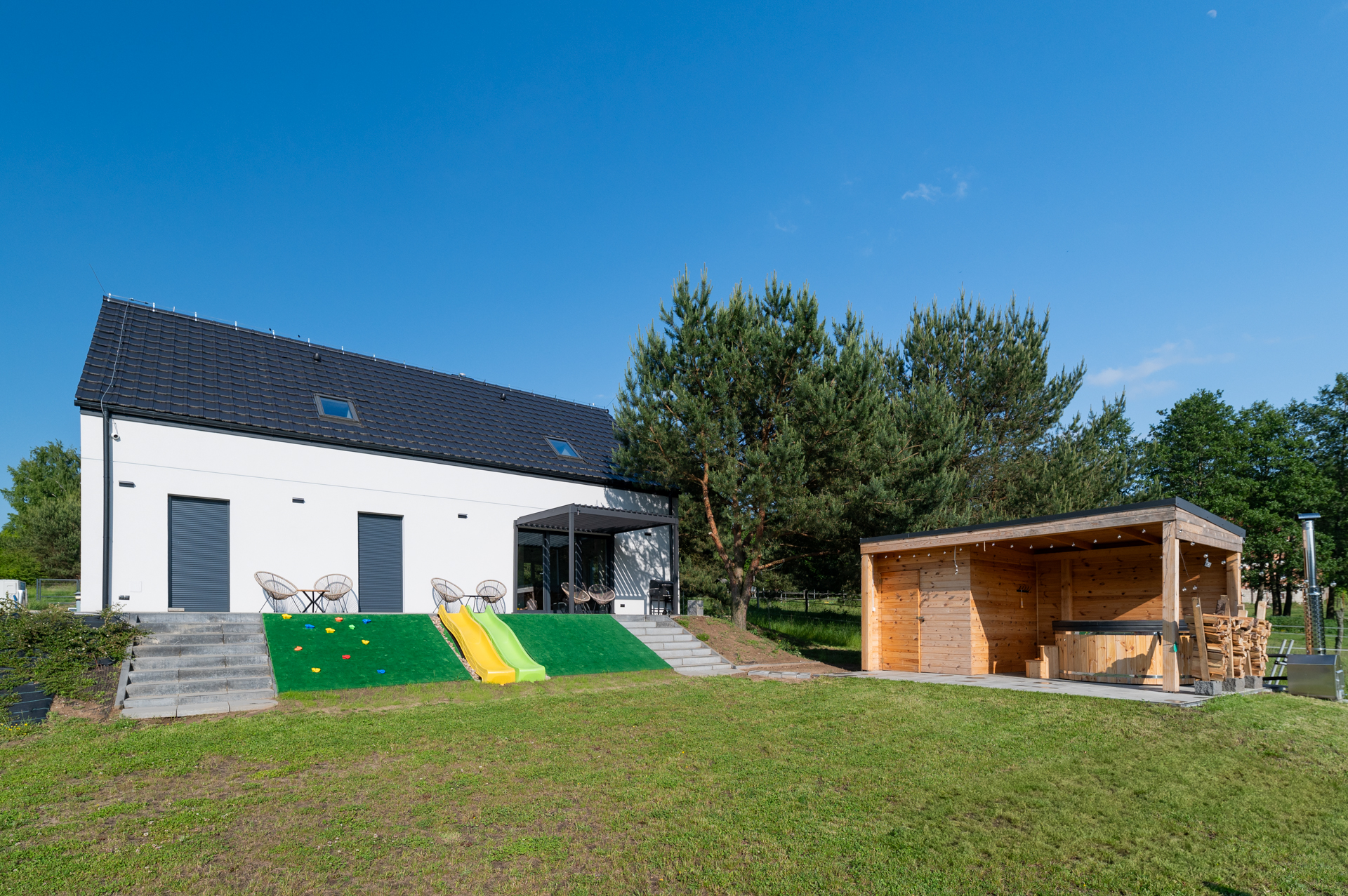 z możliwością otwierania dachu, stół, krzesła oraz miejsce do zabaw dla dzieci bezpośrednio z tarasu.
