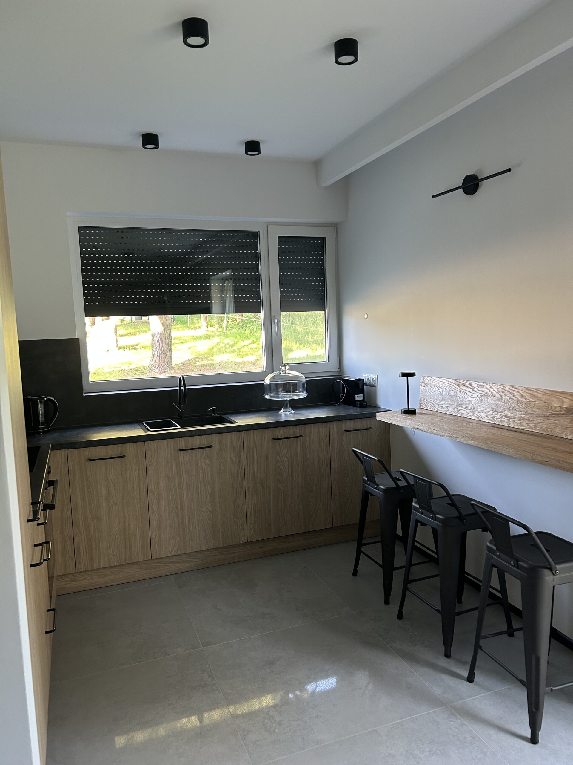 z blatem barowym, hokerami, dużą lodówką, zmywarką, naczyniami i wszystkimi niezbędnymi akcesoriami oraz AGD dla Twojego komfortu.