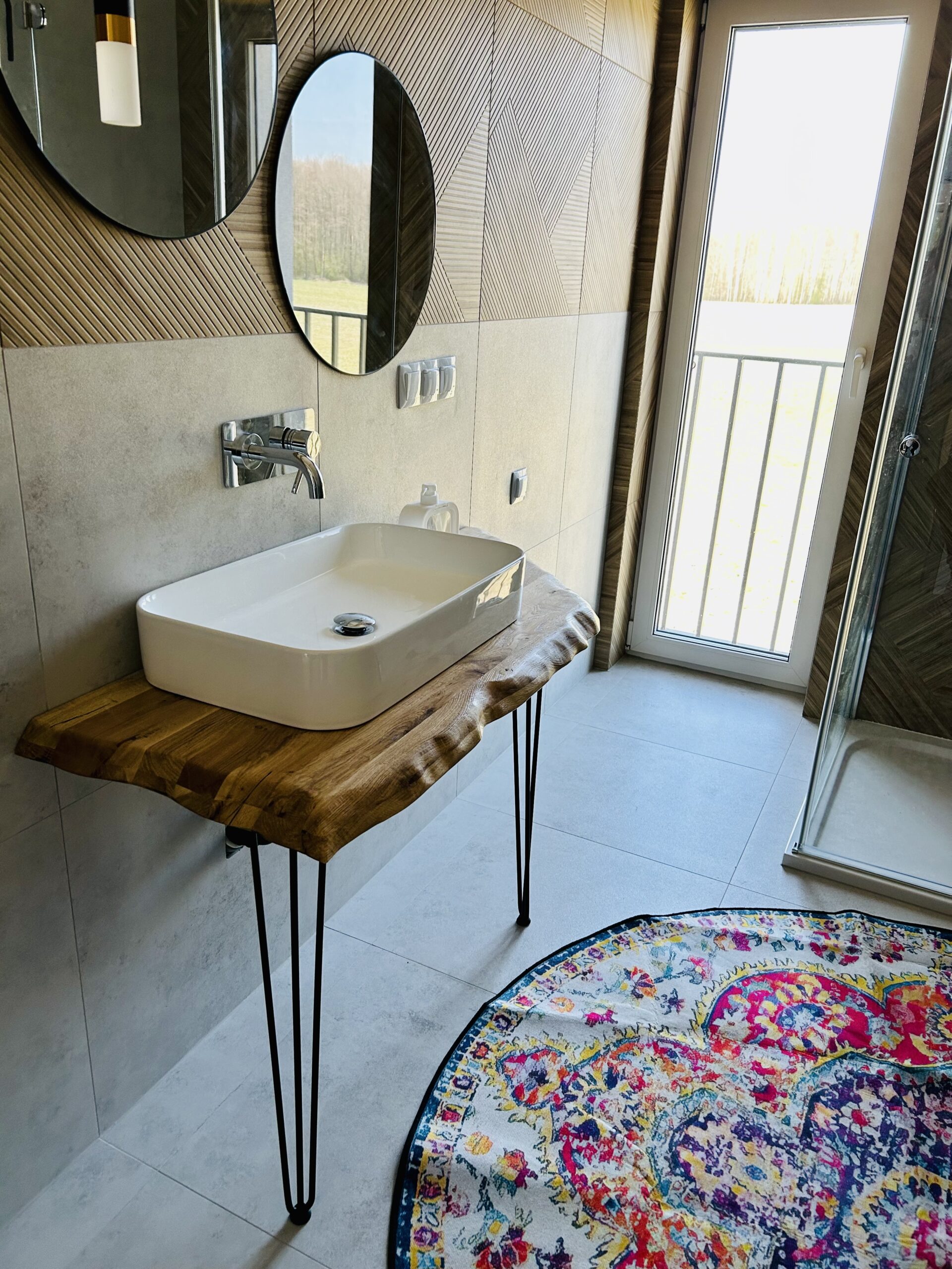 Z drewnianą konsolą umywalkową, pralką, suszarką, kosmetykami i ręcznikami.